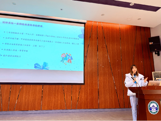 麥嘉麗學姐以「個人職業路徑探索」為主題,詳細分享了她在武漢大學法學學士及香港理工大學建築法及爭議解決碩士的求學歷程,她強調在學期間的實習積累是職業探索的關鍵。