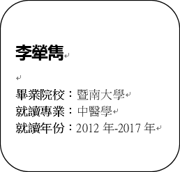 2012年是一個很特別的日子,正好就是第一屇香港中學文憑試及最後一屇香港高級程度會考的交替之年。芸芸學子都在選擇不同的學業途徑,而我完成最後一屇香港高級程度會考考試後,對前途感到迷茫與期待。從中學畢業後,我選擇了前住內地院校修讀中醫課程。從當初對內地的不熟悉,到現在感覺祖國的發展與先進已經十分成功及成熟,實在令我很為祖國感到驕傲。