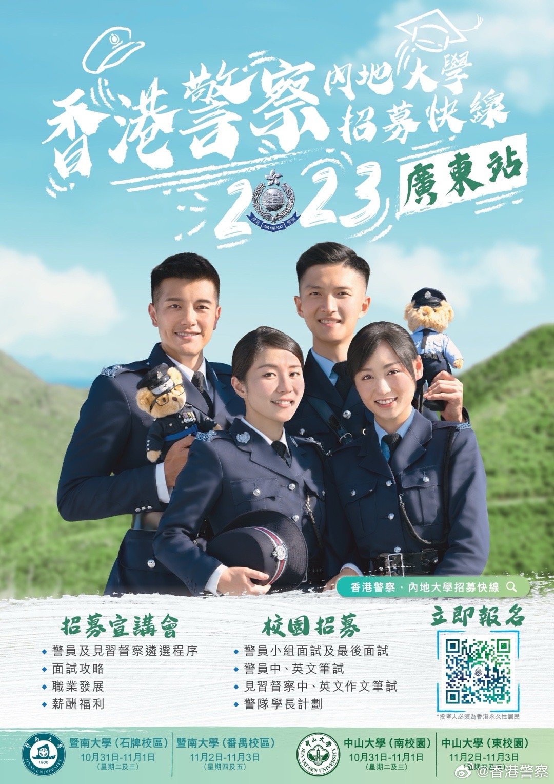 警察招募組將於10月31日(星期二)至11月3日(星期五)分別到廣東省的暨南大學和中山大學進行警察招募活動,為內地升學的港生舉辦「香港警察• 內地大學招募快線(廣東站),行程如下: