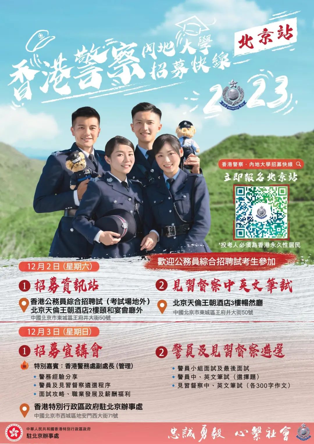 香港警察招募組將於12月2日(星期六)至12月3日(星期日)會到北京進行警察招募活動,為內地升學的港生舉辦「香港警察• 內地大學招募快線(北京站)」。歡迎在2023/24學年、2024/25學年畢業的大學生以及已經畢業的大學生參加是次的招募活動!