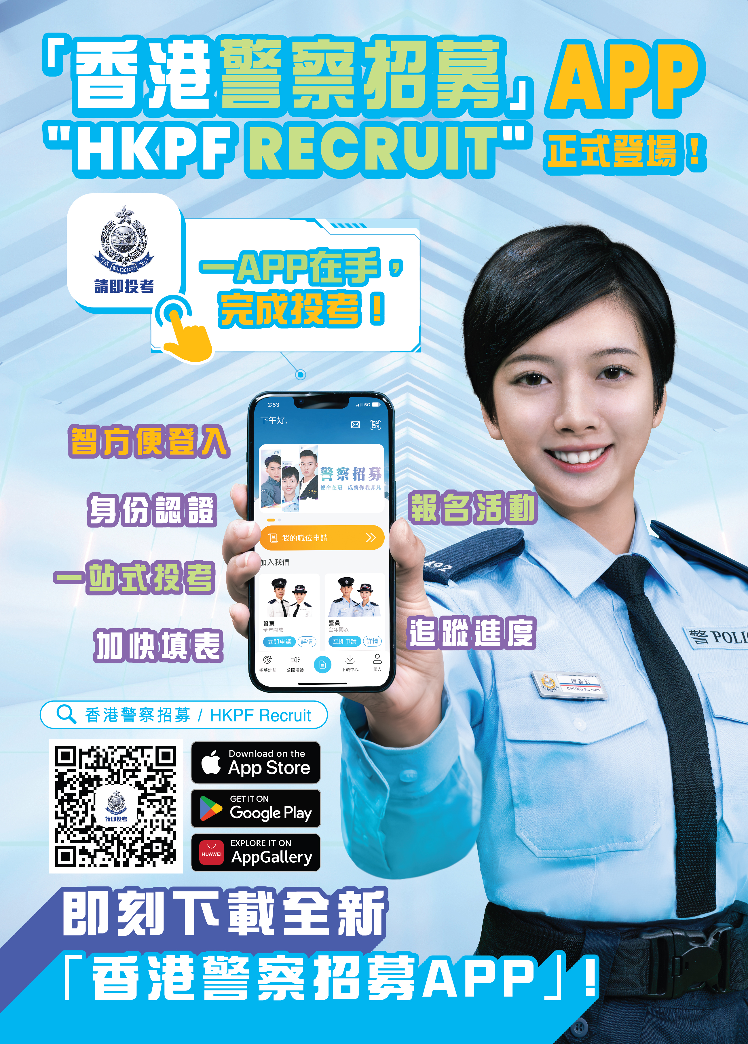 全新的「招募應用程式」(HKPF Recruit)讓市民可以透過流動電話遞交警察職位申請,並將申請流程數碼化。市民可隨時隨地追蹤遴選進度,包括面試日期及結果;亦可報名參加「警察招募.體驗日」和「警隊學長計劃」等活動,達致「一機在手,完成投考」。是次項目警隊亦與數字政策辦公室合作,讓市民可通過「智方便」登入應用程式,節省填寫資料的時間。