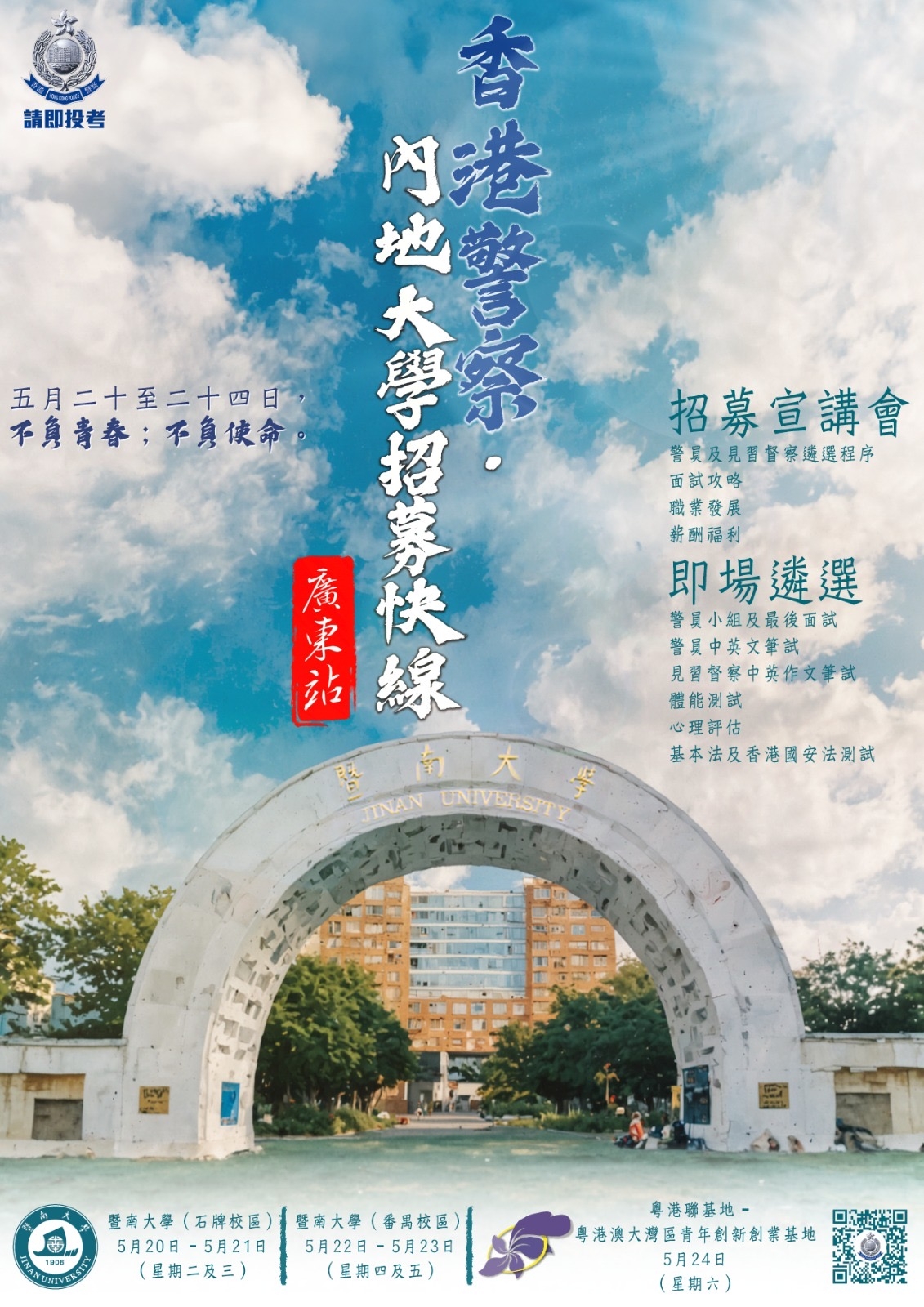 香港警察招募组将于5月中旬,再次去到广东,为所有当地就读的香港学⽣举办「香港警察 • 内地⼤学招募快线 (⼴东站)」。