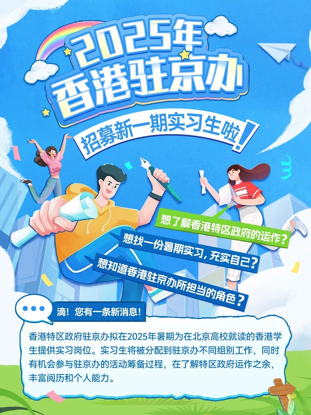 香港特區政府駐京辦擬在2025年暑期為在北京高校就讀的香港學生提供實習崗位。實習生將被分配到駐京辦不同組別工作,同時有機會參與駐京辦的活動籌備過程,在了解特區政府運作之餘,豐富閱歷和個人能力。